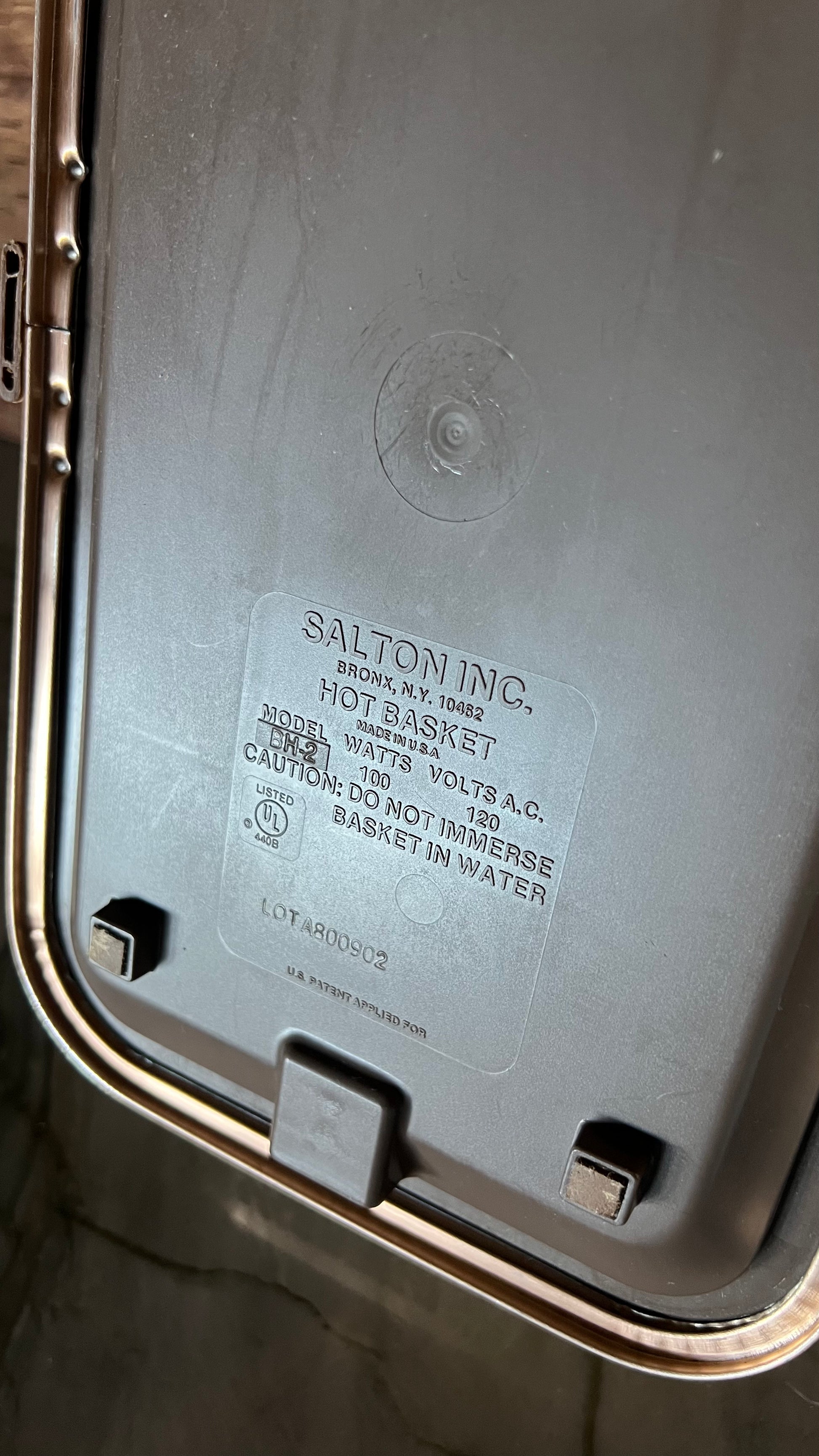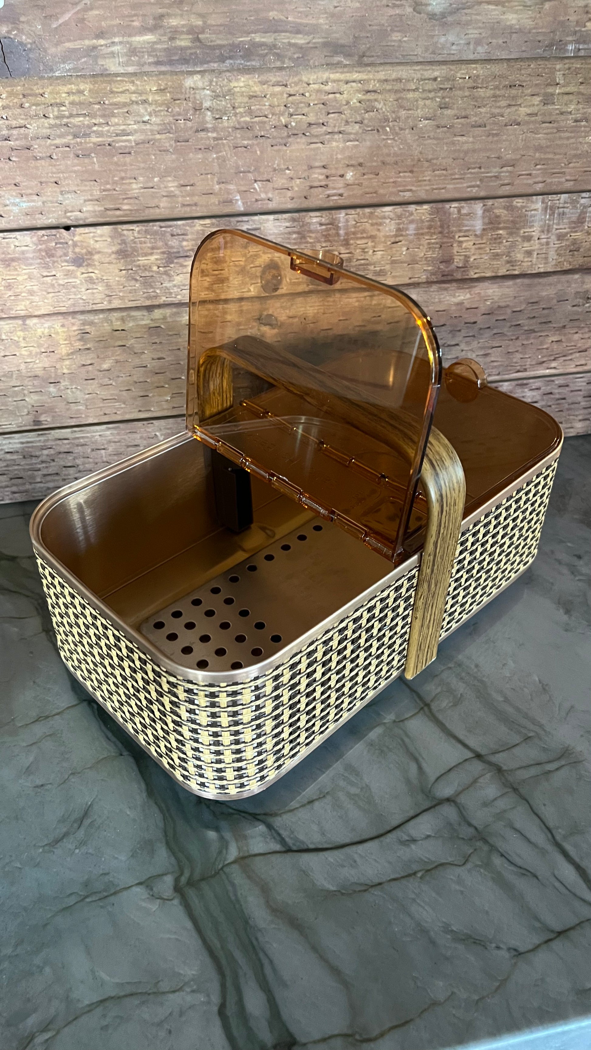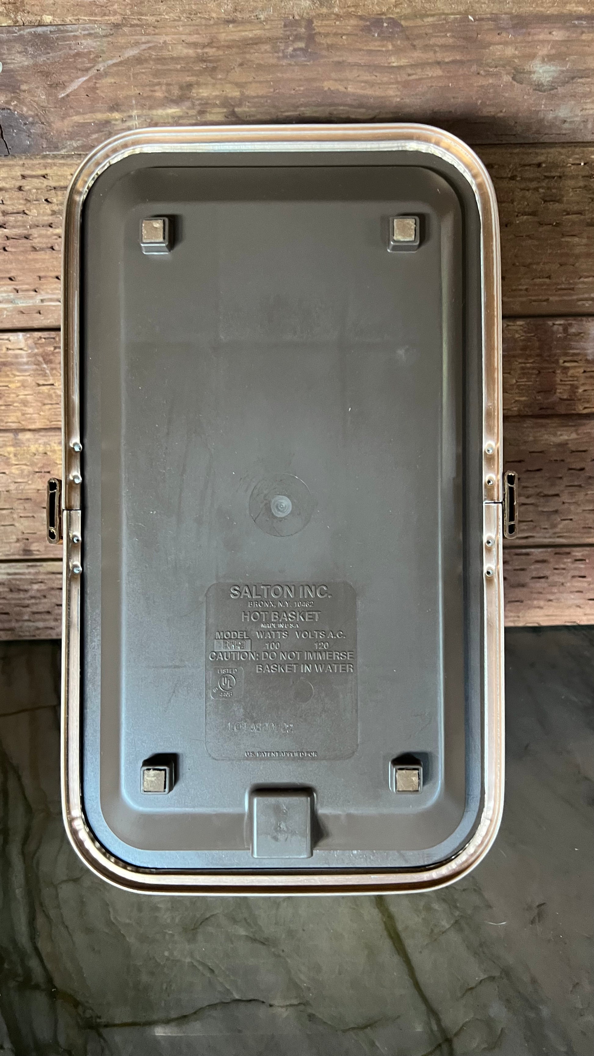 New old stock! Beautiful Salton Cosmopolitan Hot Basket bread warmer. Measures 12” long by 7” wide. This basket features an amber colored cover, and can be opened from both sides. In excellent vintage condition, appears to never have been used! Comes with the box, still in working condition!