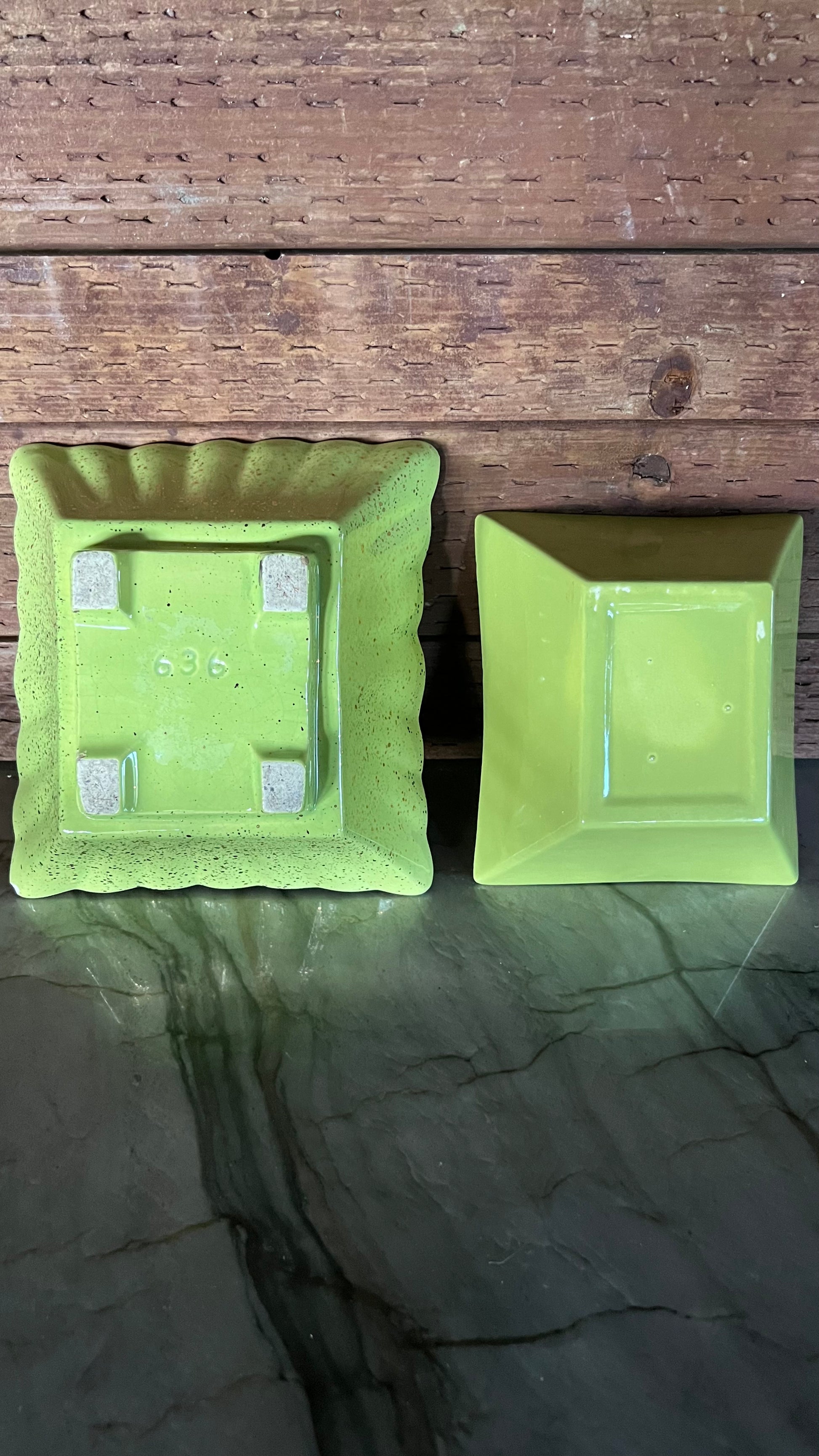 Cute vintage green fluted dish set with wire cart. Larger dish measures 6.5” by 6”. Smaller dish measures 5.5” by 4 5/8”. Wire cart measures approximately 7.5” at its widest point by 5 1/8”. Largest dish fits nicely in the cart. In good vintage condition, with a couple of small chips, see photos for more details.