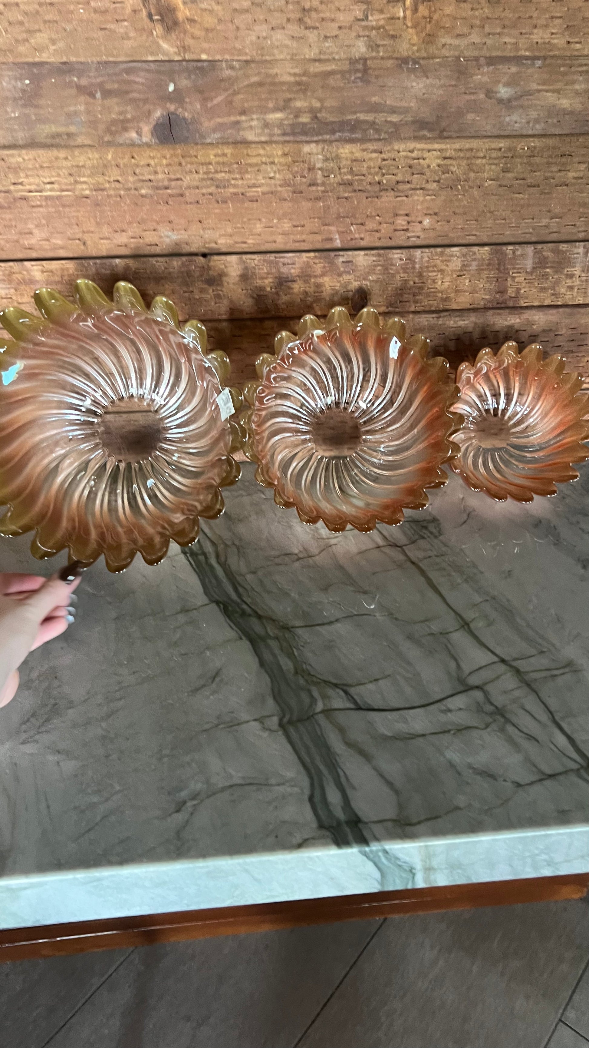 Set of three incredible Mikasa Studio Nova Solaris Gold nesting bowls. The largest bowl still has the original product tag! This set is in very good vintage condition, likely only used for display. The largest bowl is slightly lighter in color than the other two, see photos. The largest bowl measures 9” in diameter, the medium bowl measures 7.5” in diameter, and the smallest bowl measures 5.75” in diameter. Beautiful set!