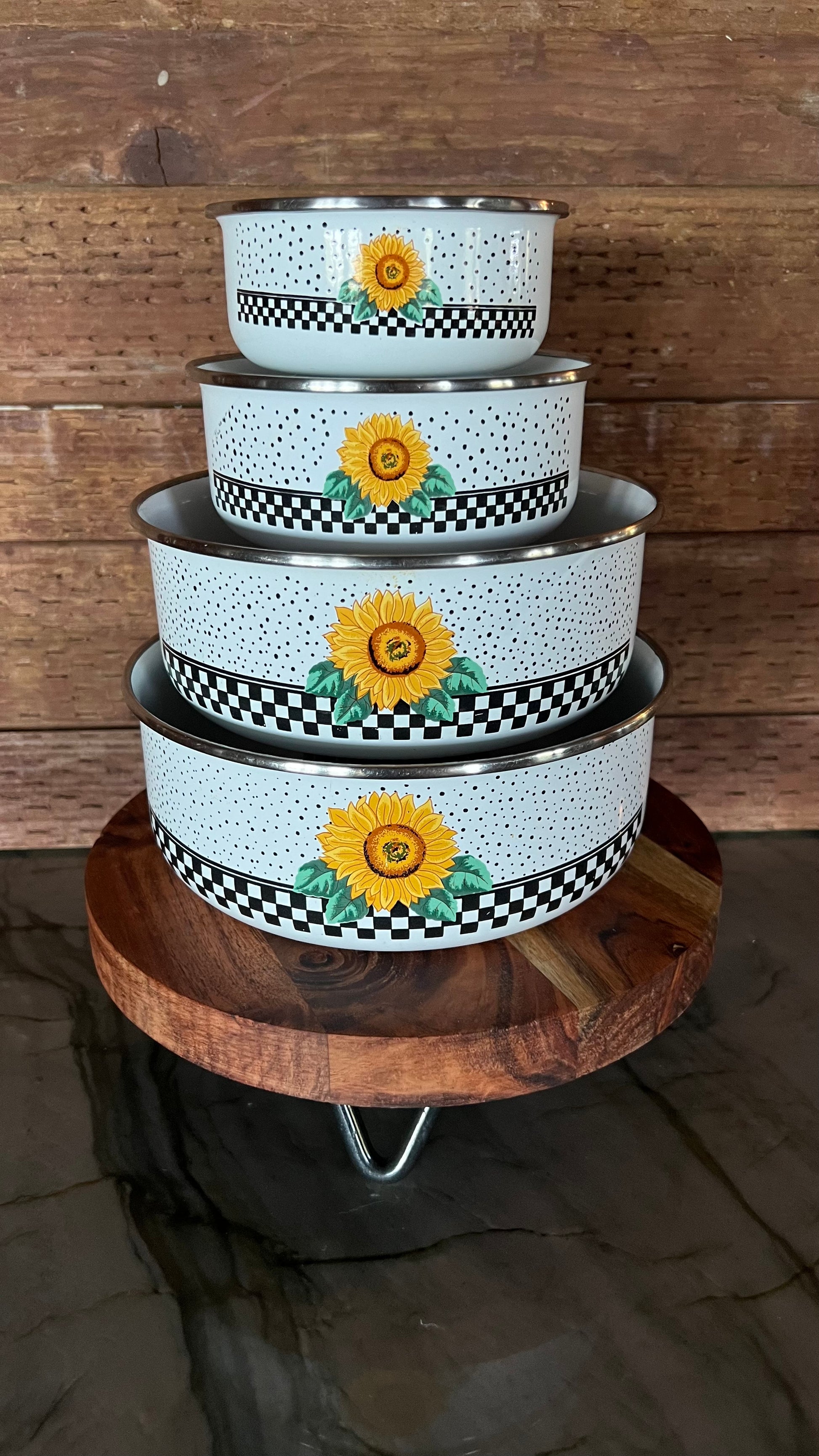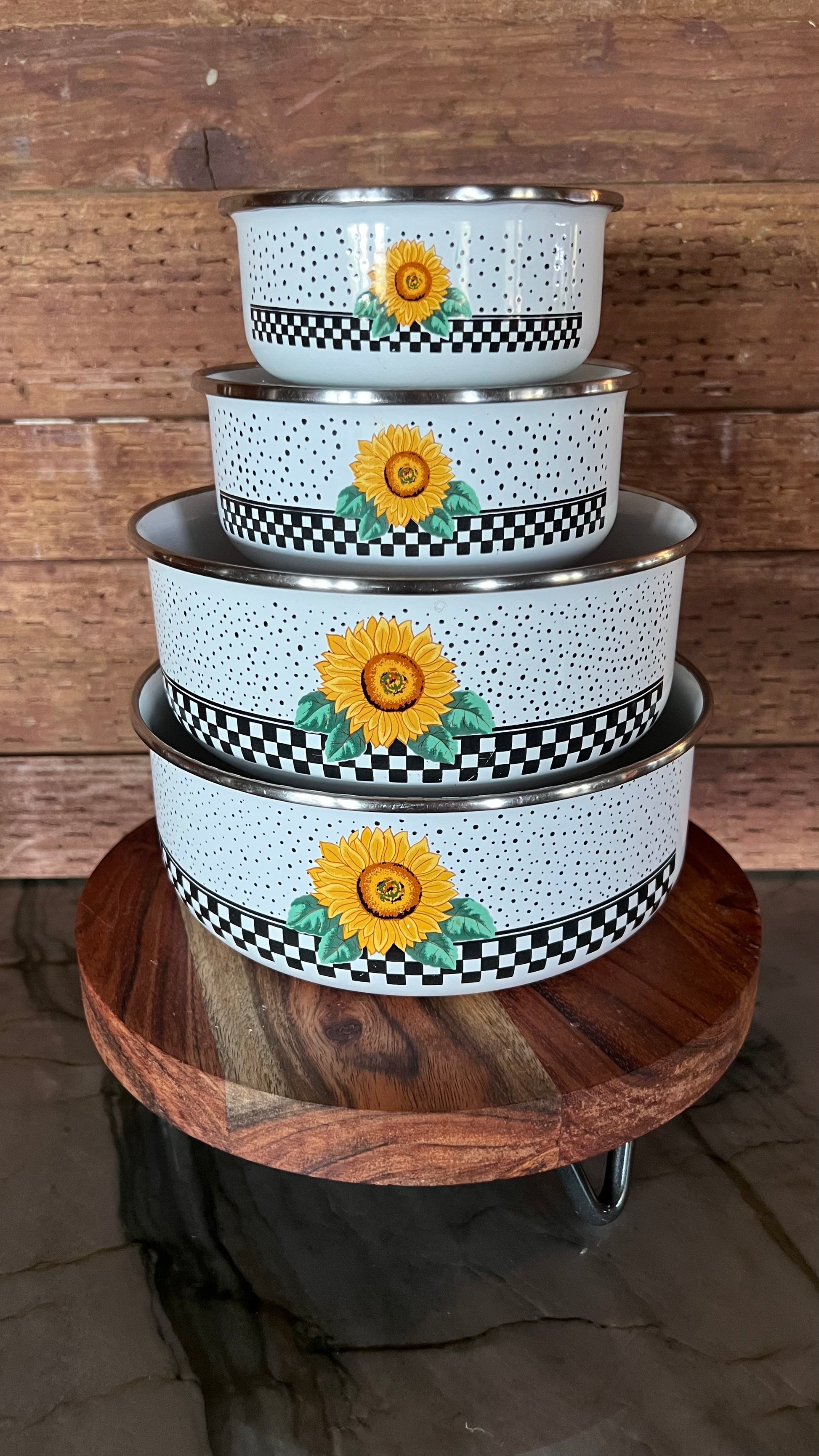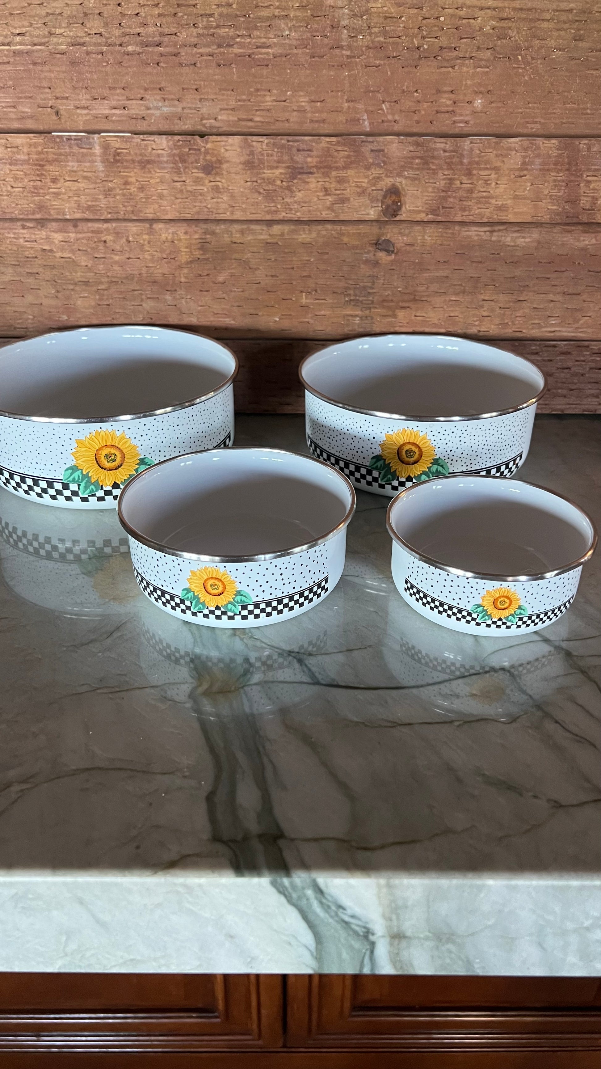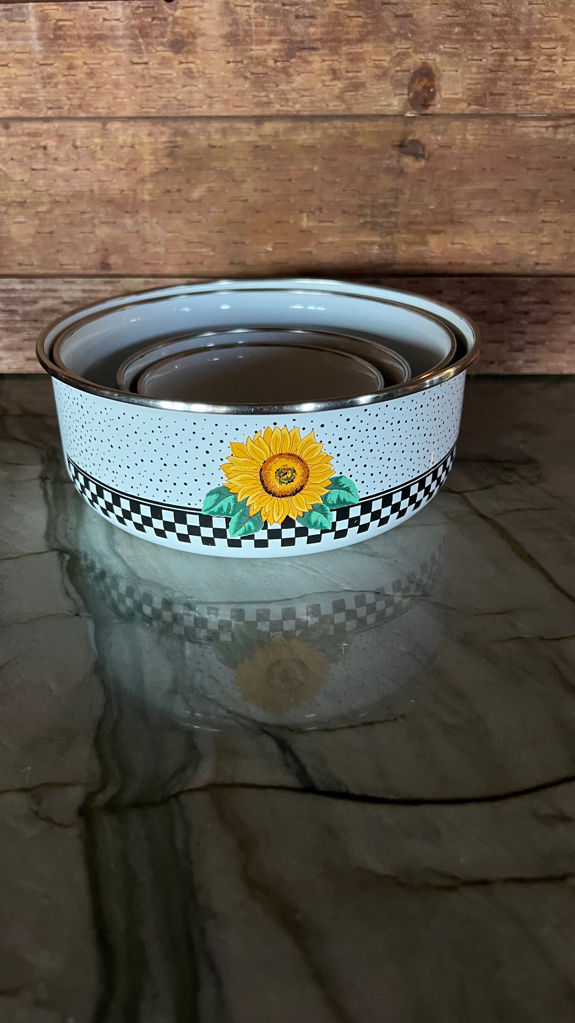 Vintage set of 4 tin/enamel nesting bowls. Cute sunflower and checkered pattern, called Sunny. Manufactured by Tabletops Unlimited. In very good vintage condition, only showing some wear on the bottom of a couple of the bowls. See pictures for more details.