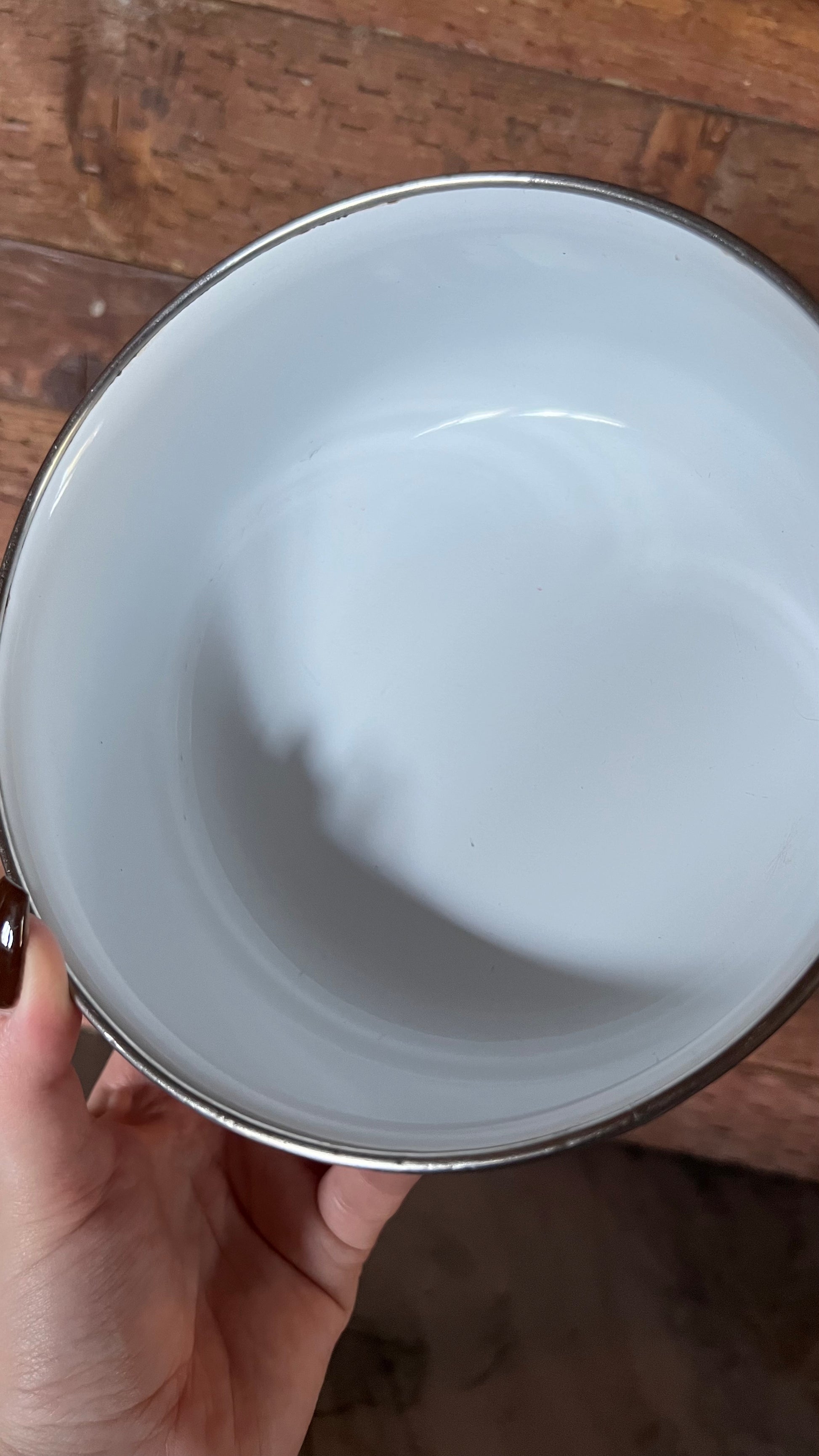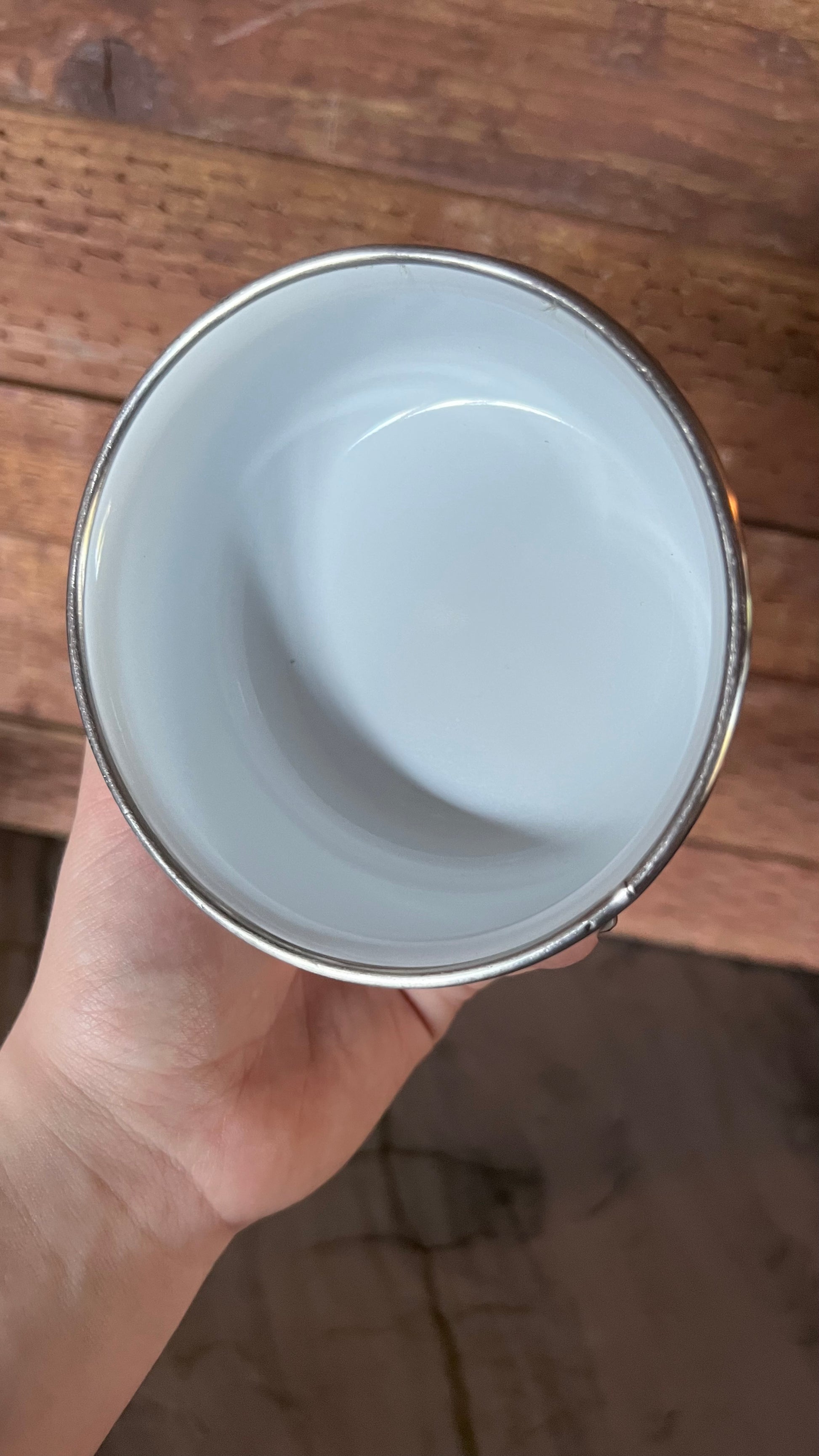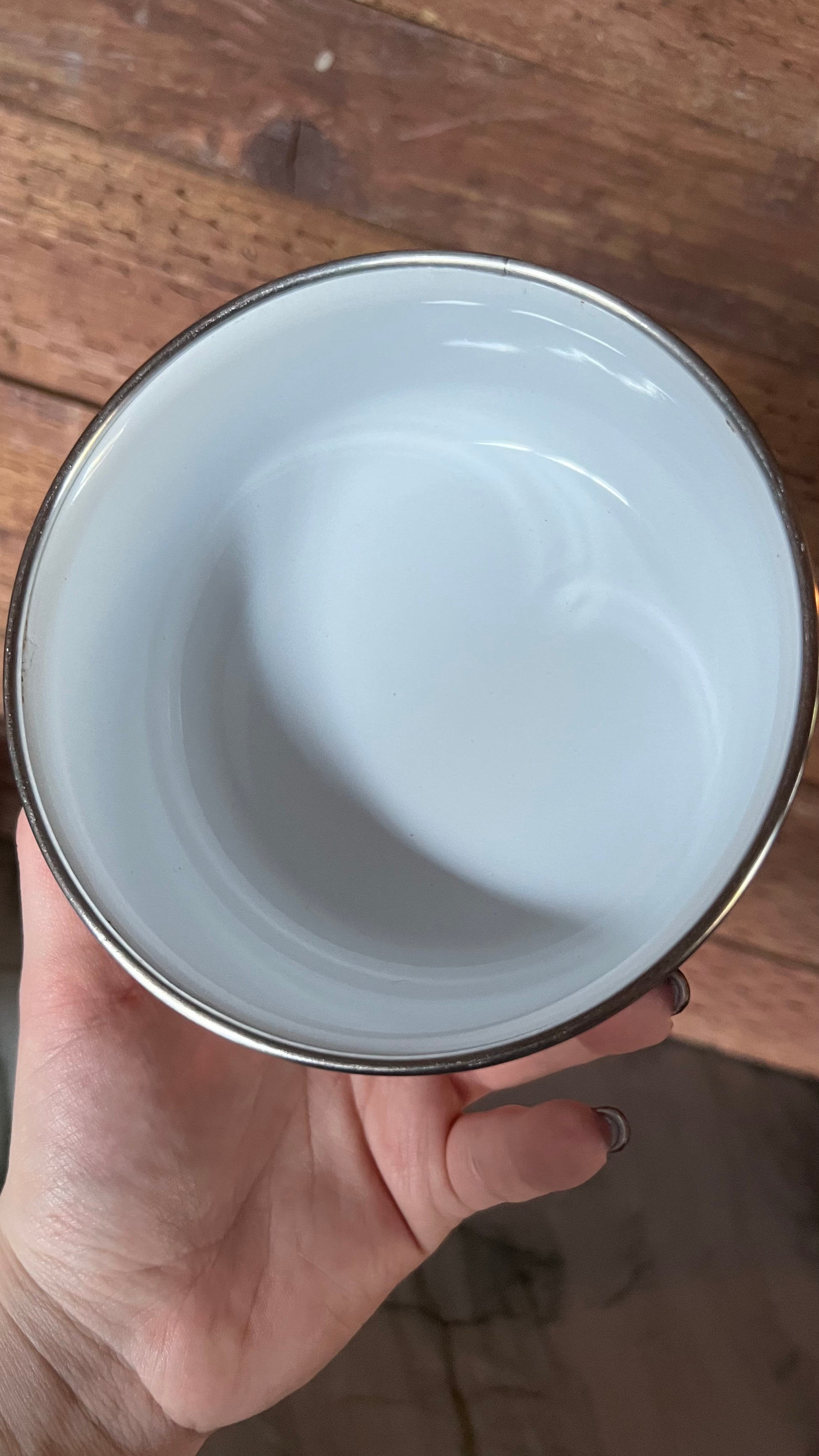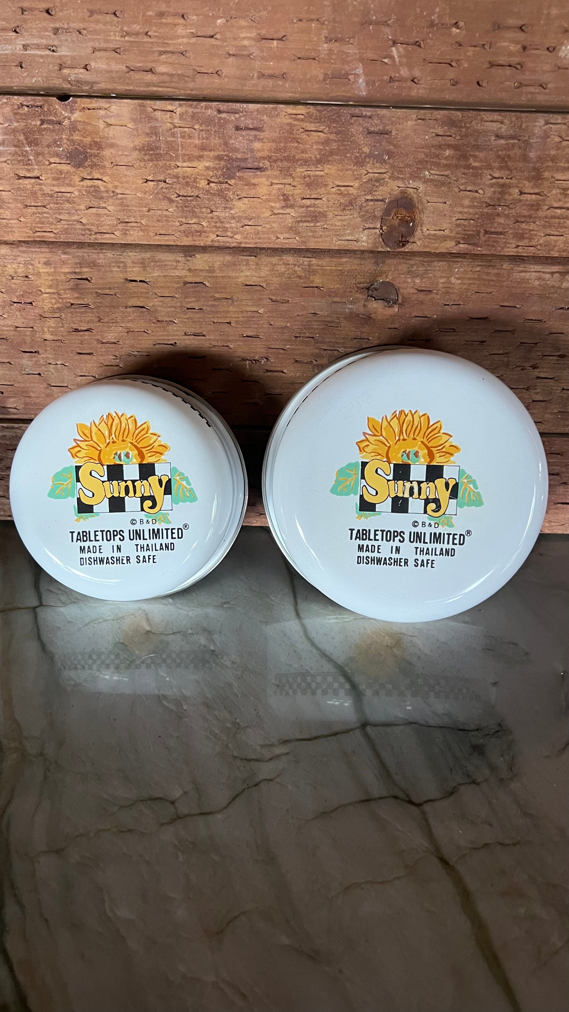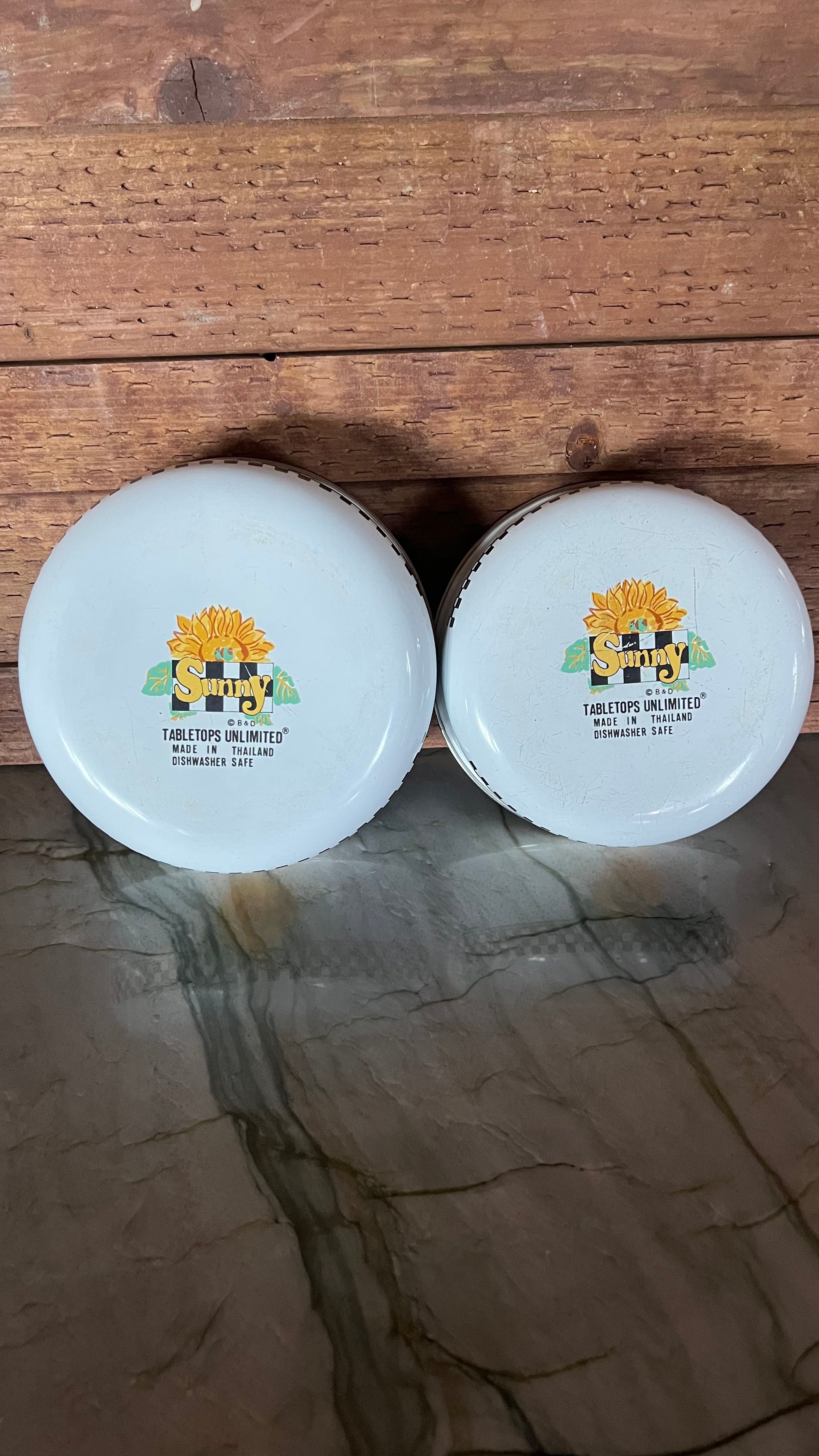 Vintage set of 4 tin/enamel nesting bowls. Cute sunflower and checkered pattern, called Sunny. Manufactured by Tabletops Unlimited. In very good vintage condition, only showing some wear on the bottom of a couple of the bowls. See pictures for more details.