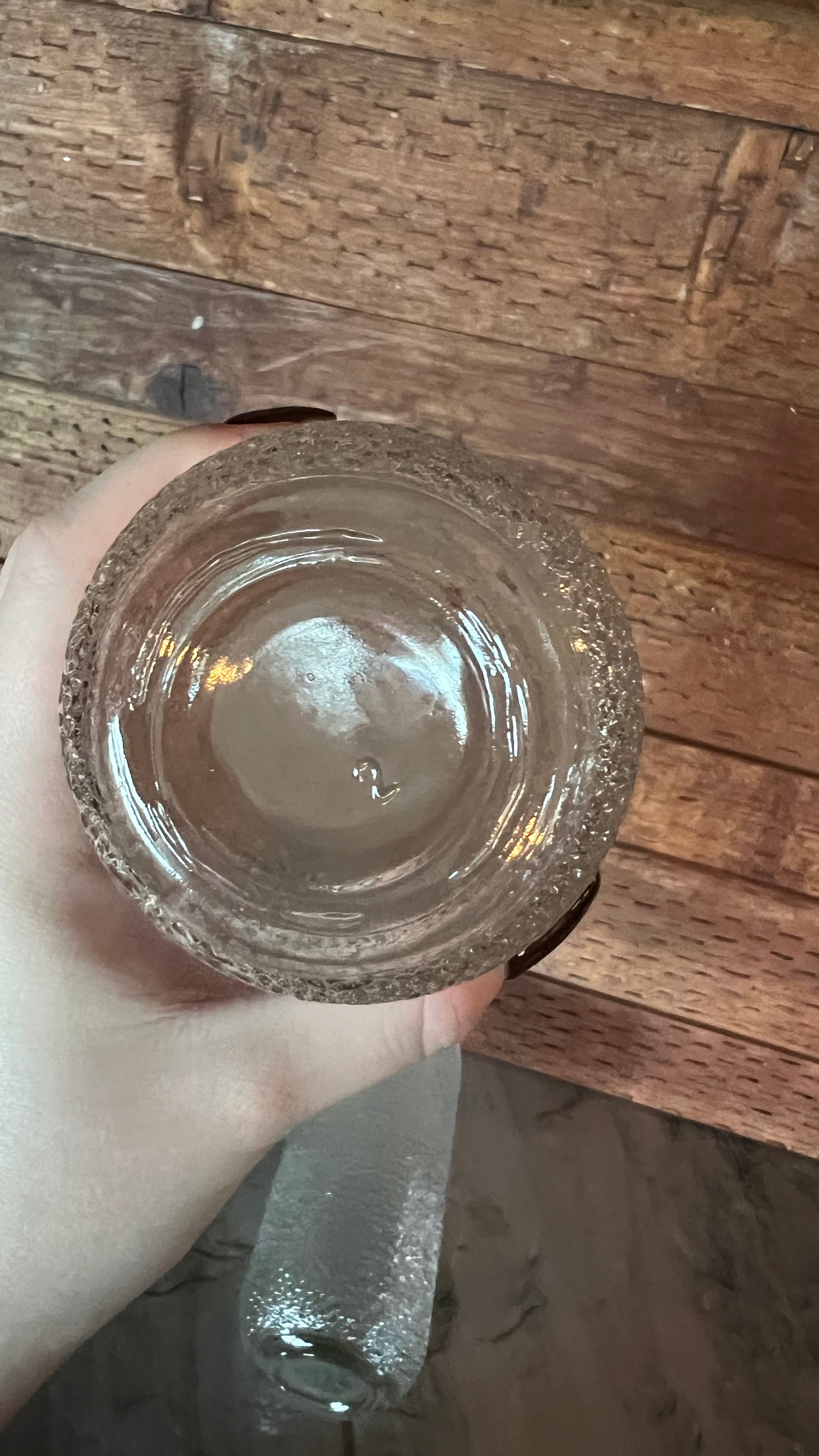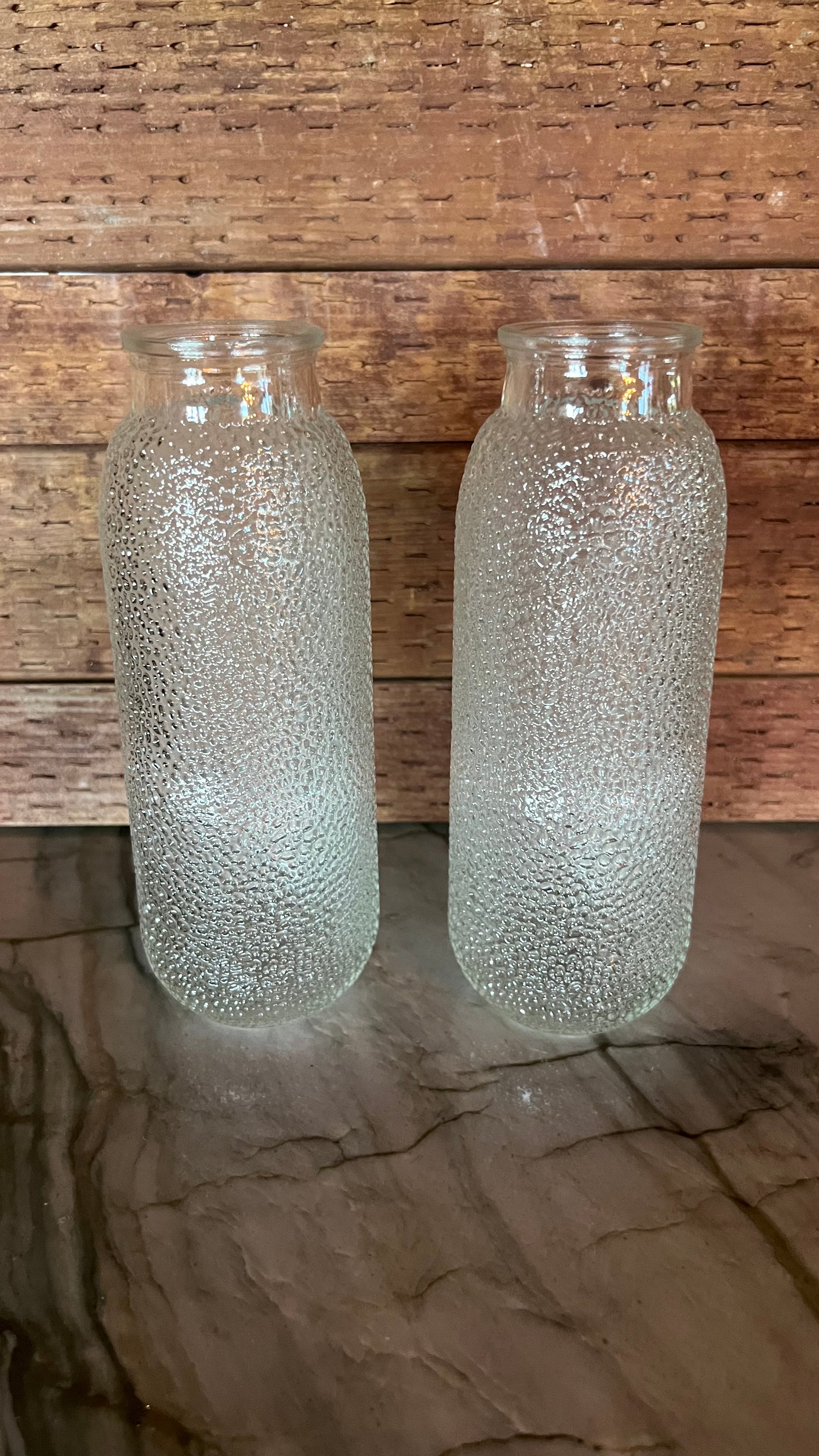 Set of two vintage textured glass bottles. Measures 7.75” and 2.75” in diameter at the base. Can be used as bud vases, as well. Excellent vintage condition, both stamped with a #2 on the bottom.