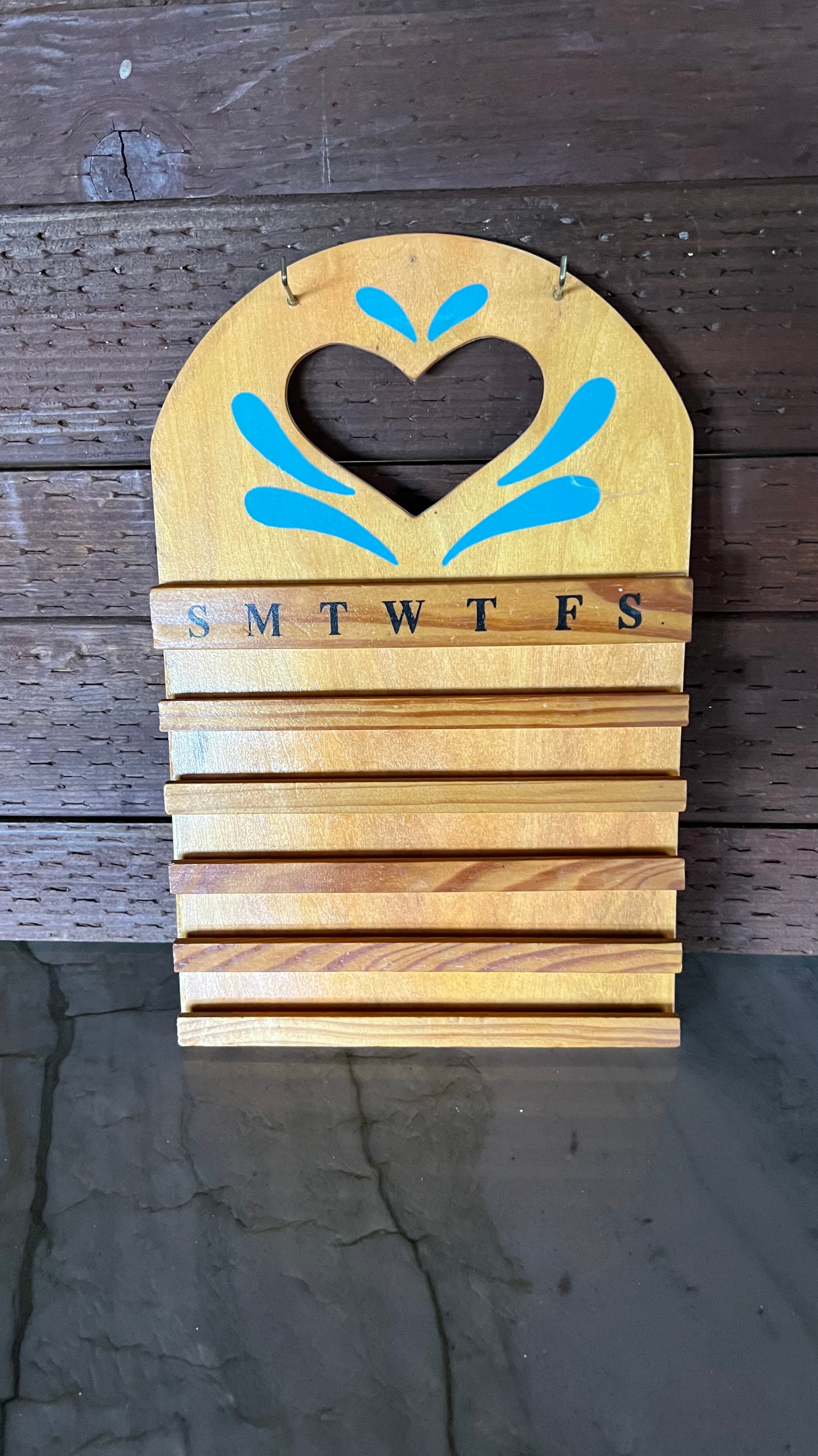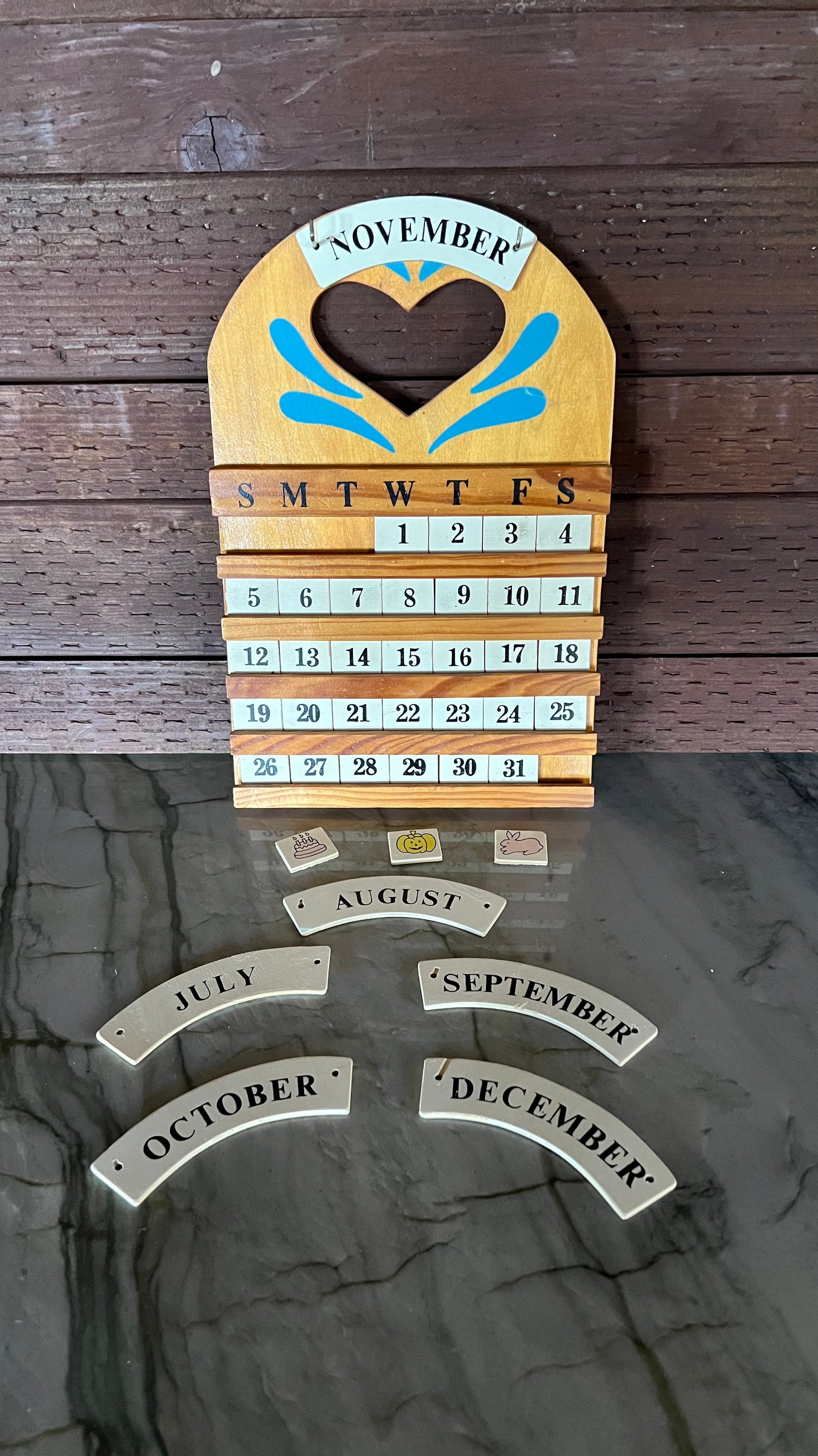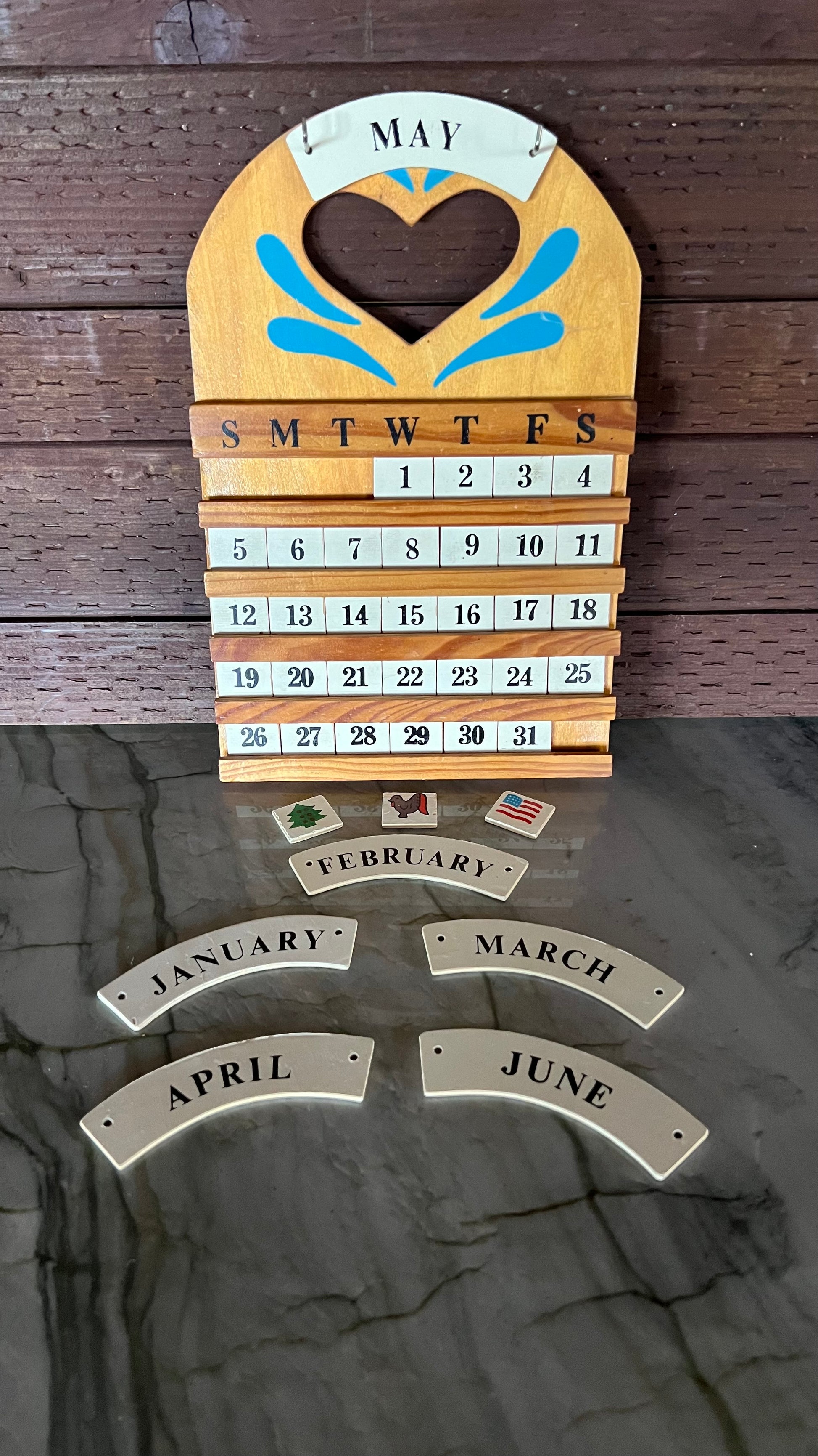 Vintage wooden calendar with interchangeable tiles. All months (reversible!), days, and holiday tiles (reversible!) are included. All pieces are in good vintage condition, some pieces showing wear. Adorable set!