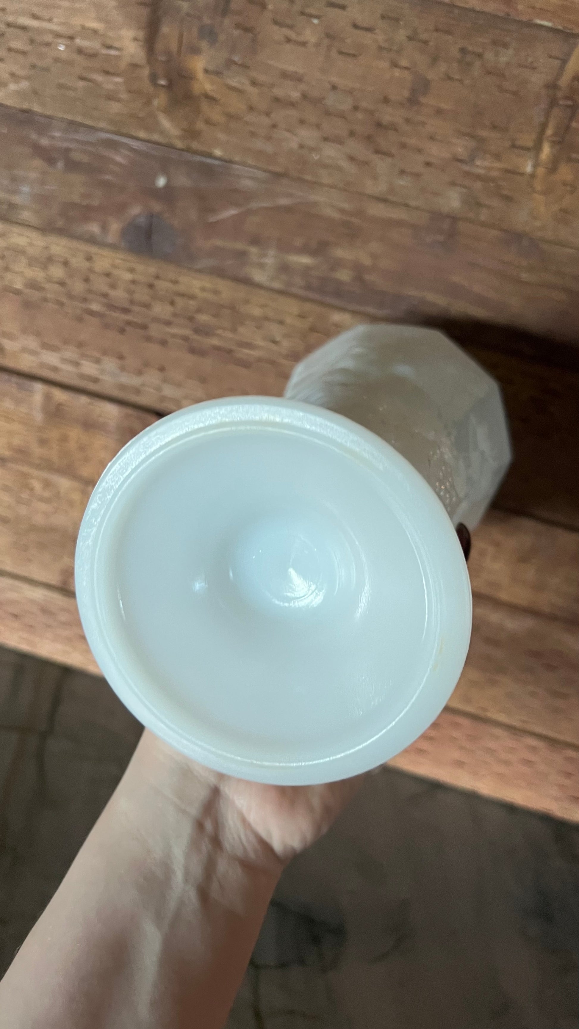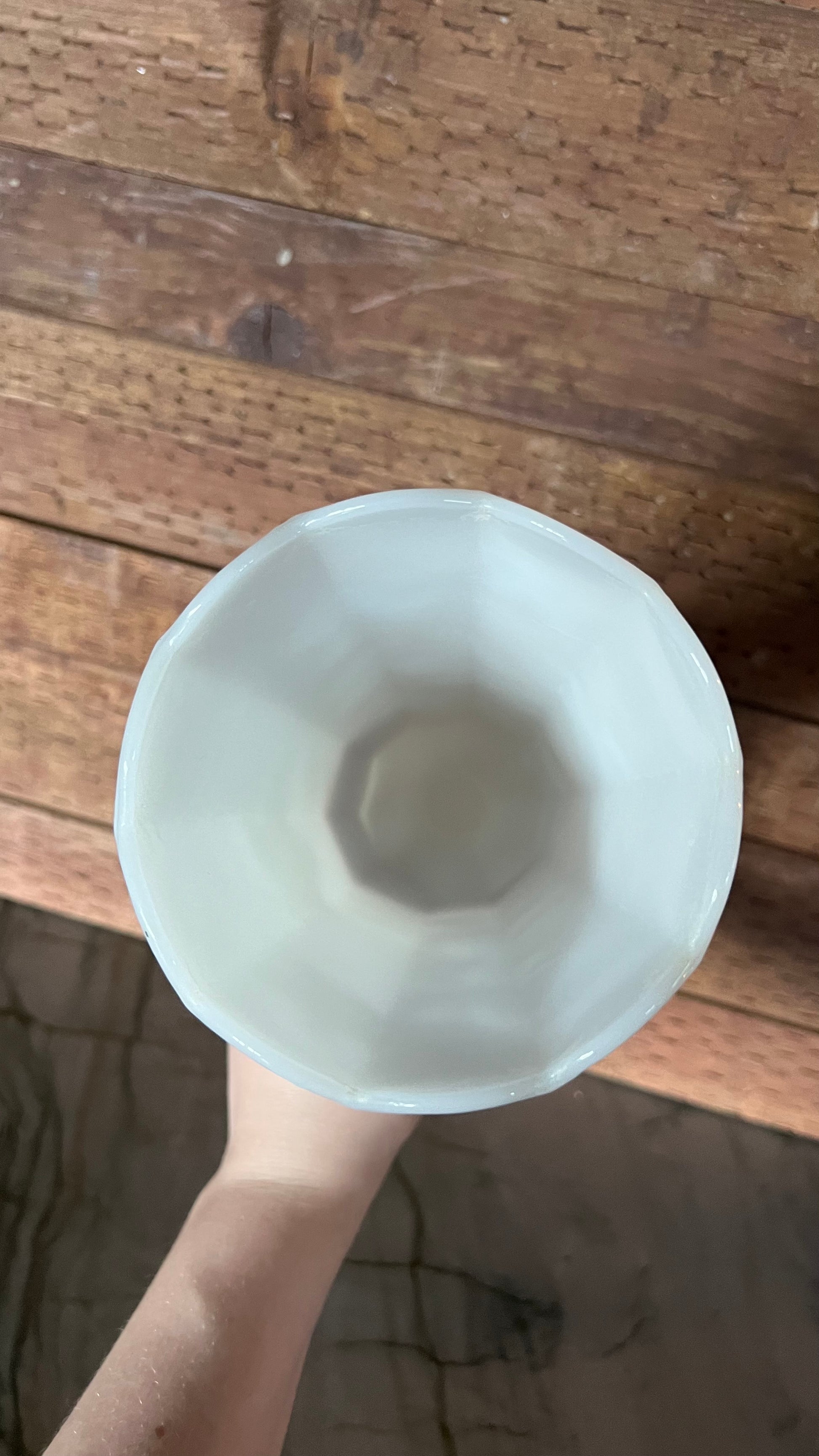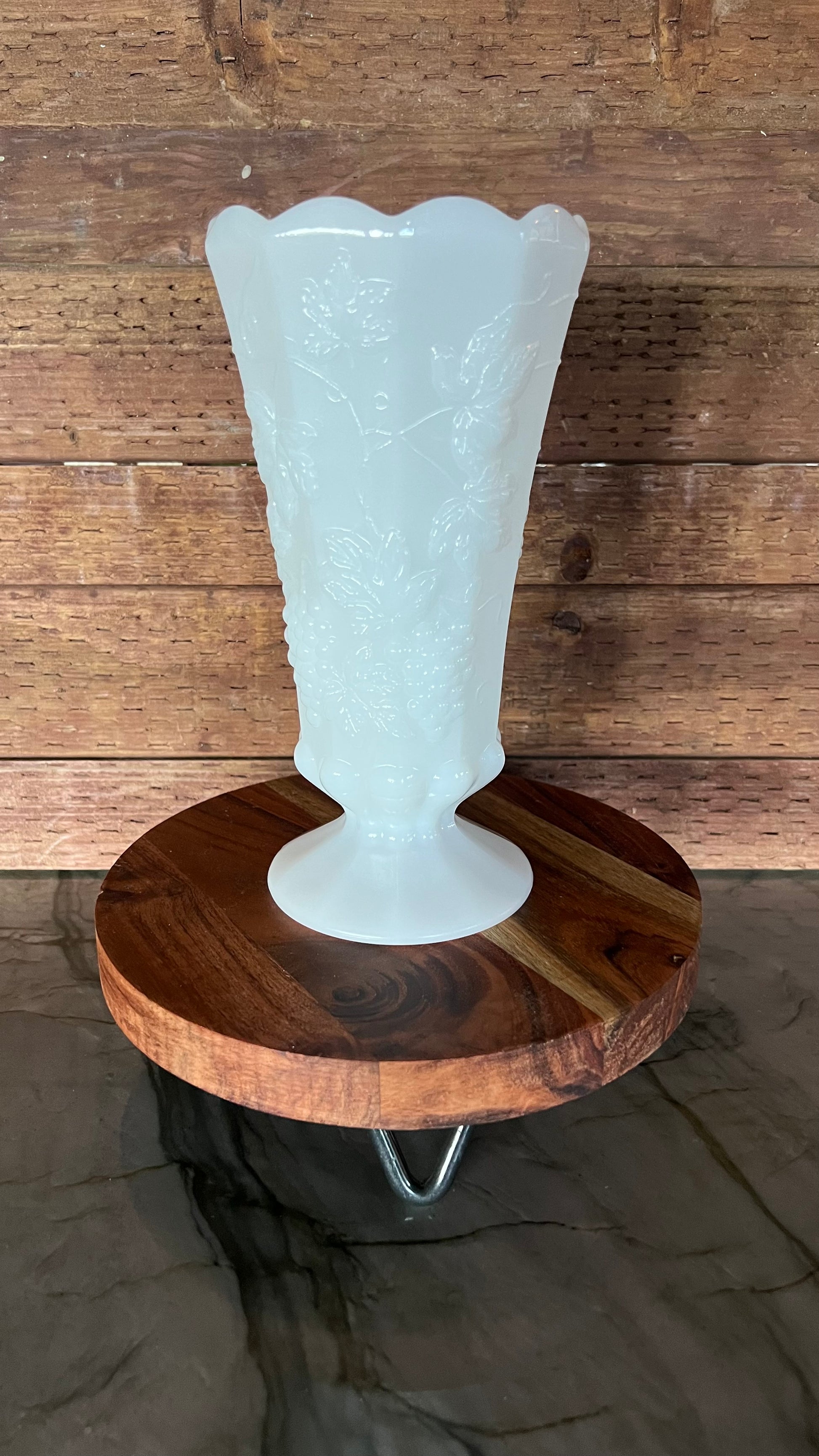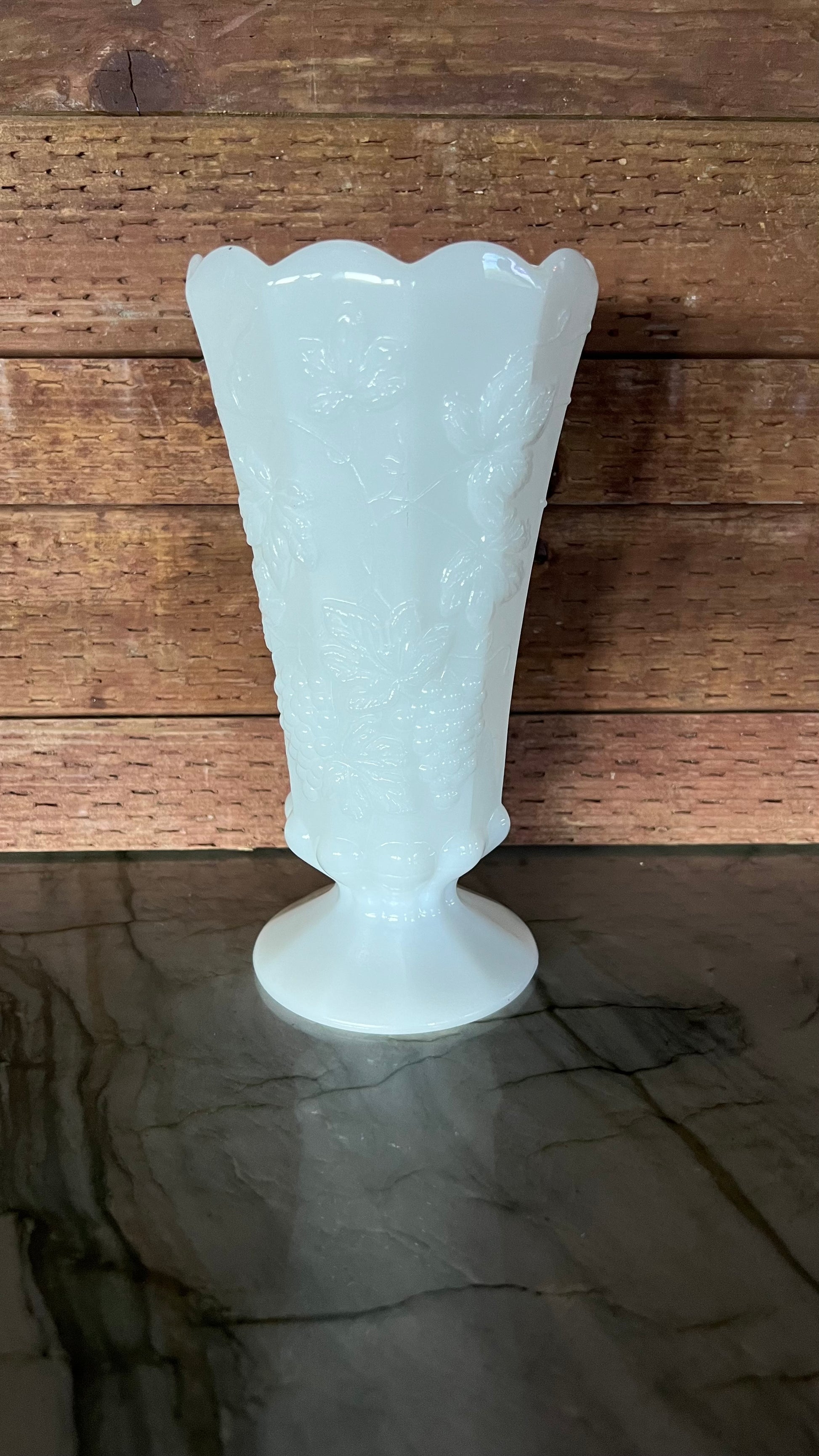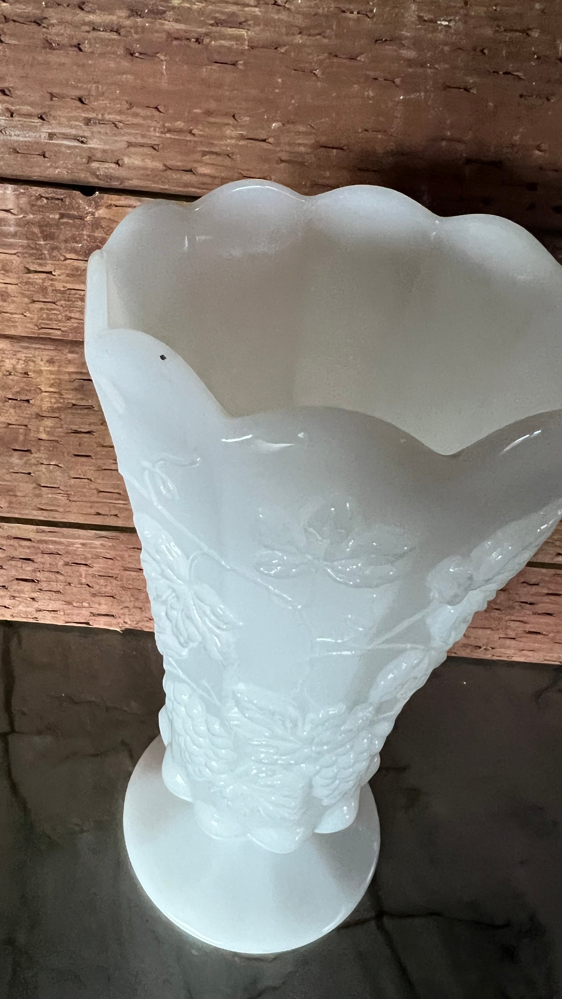 Vintage Westmoreland paneled milk glass vase. Grape and vine pattern. Measures about 9” tall with a 4” diameter. In excellent vintage condition!